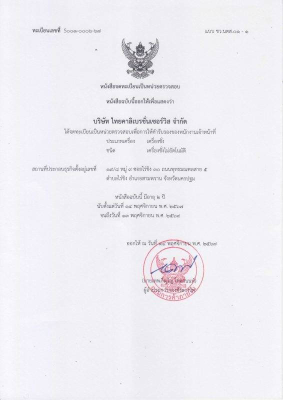 ได้รับการขึ้นทะเบียนเป็นหน่วยตรวจสอบ เพื่อการให้คำรับรองพนักงานเจ้าหน้าที่ ประเภท เครื่องชั่ง ชนิด เครื่องชั่งไม่อัตโนมัติ (เครื่องชั่งรถยนต์)